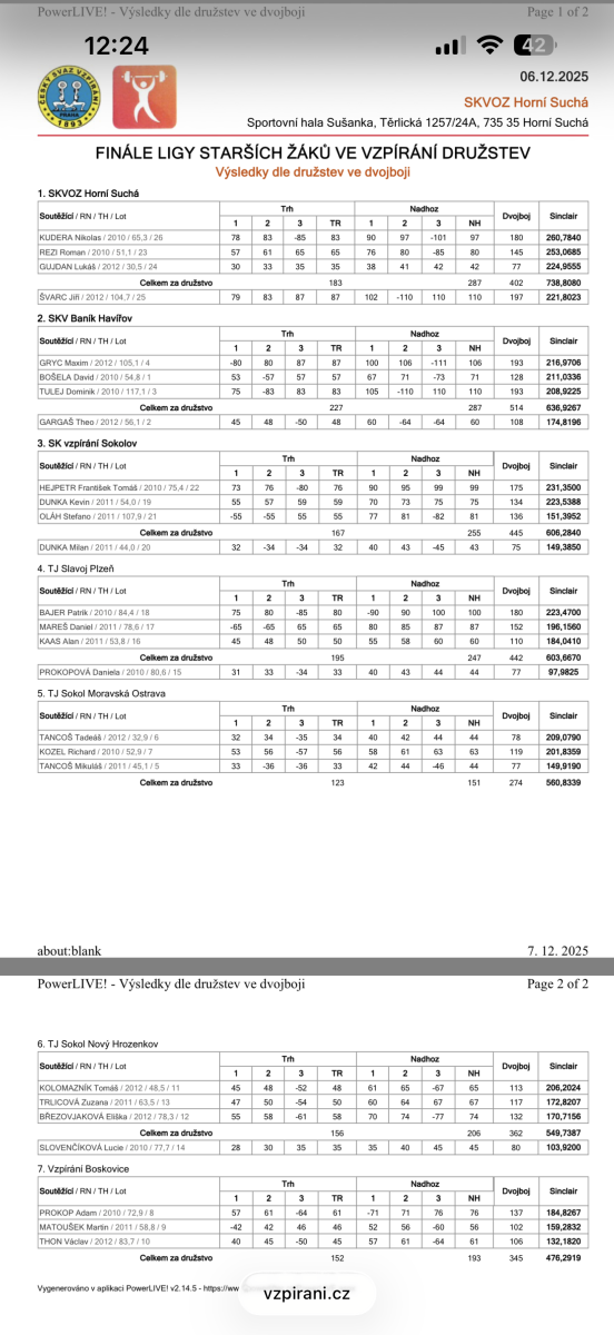 V sobotu 22. listopadu 2025 se v Novém Hrozenkově uskutečnilo Mistrovství ČR ve vzpírání mladších žáků spolu s Finále ligy mladších žáků. Do soutěží se zapojili také naši závodníci: Michael Skřivánek, Jan Hollý, Kristián Kyselý, Deana Ridzoňová a Matěj Metelka.